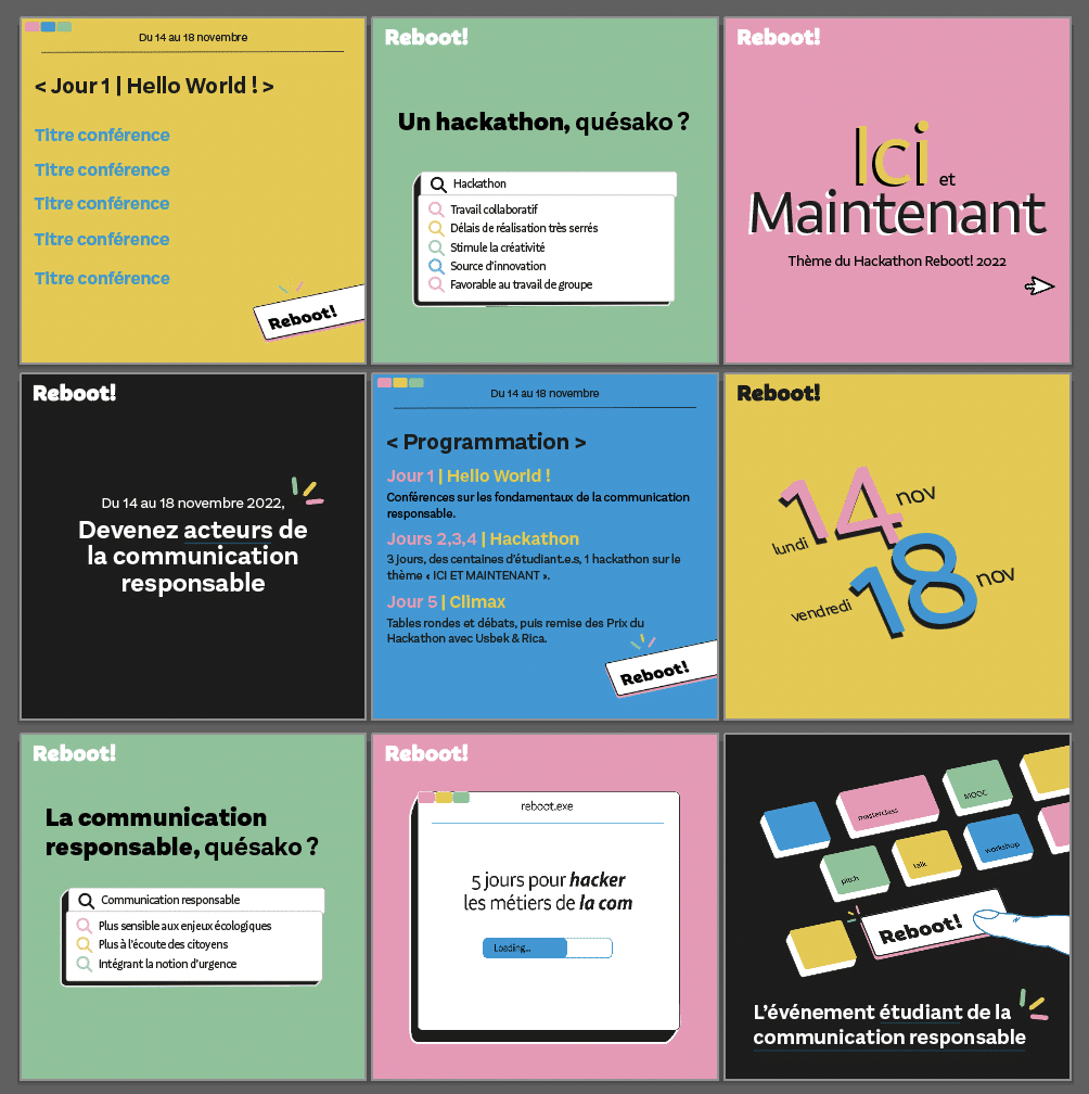 ComForGood Agency a conçu l’ensemble de la charte graphique de Reboot, un événement 100 % en ligne dédié aux étudiant·e·s en communication. Logo, univers visuel, illustrations et aspects responsables du site ont été développés pour refléter l’esprit de l’événement, dont l’objectif est de former et sensibiliser les futur·e·s professionnel·le·s de la communication aux enjeux sociétaux et environnementaux.